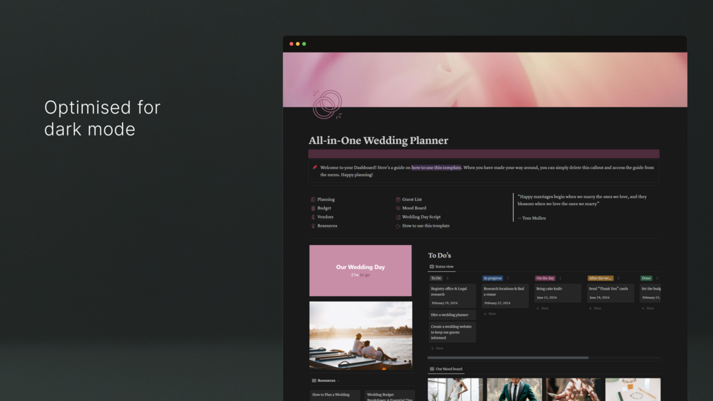 Great for Collaboration Planning a wedding often involves multiple people, including your partner, a wedding planner, and a wedding party. Notion is perfect for seamless collaboration, allowing everyone involved to contribute, comment, and stay updated.
