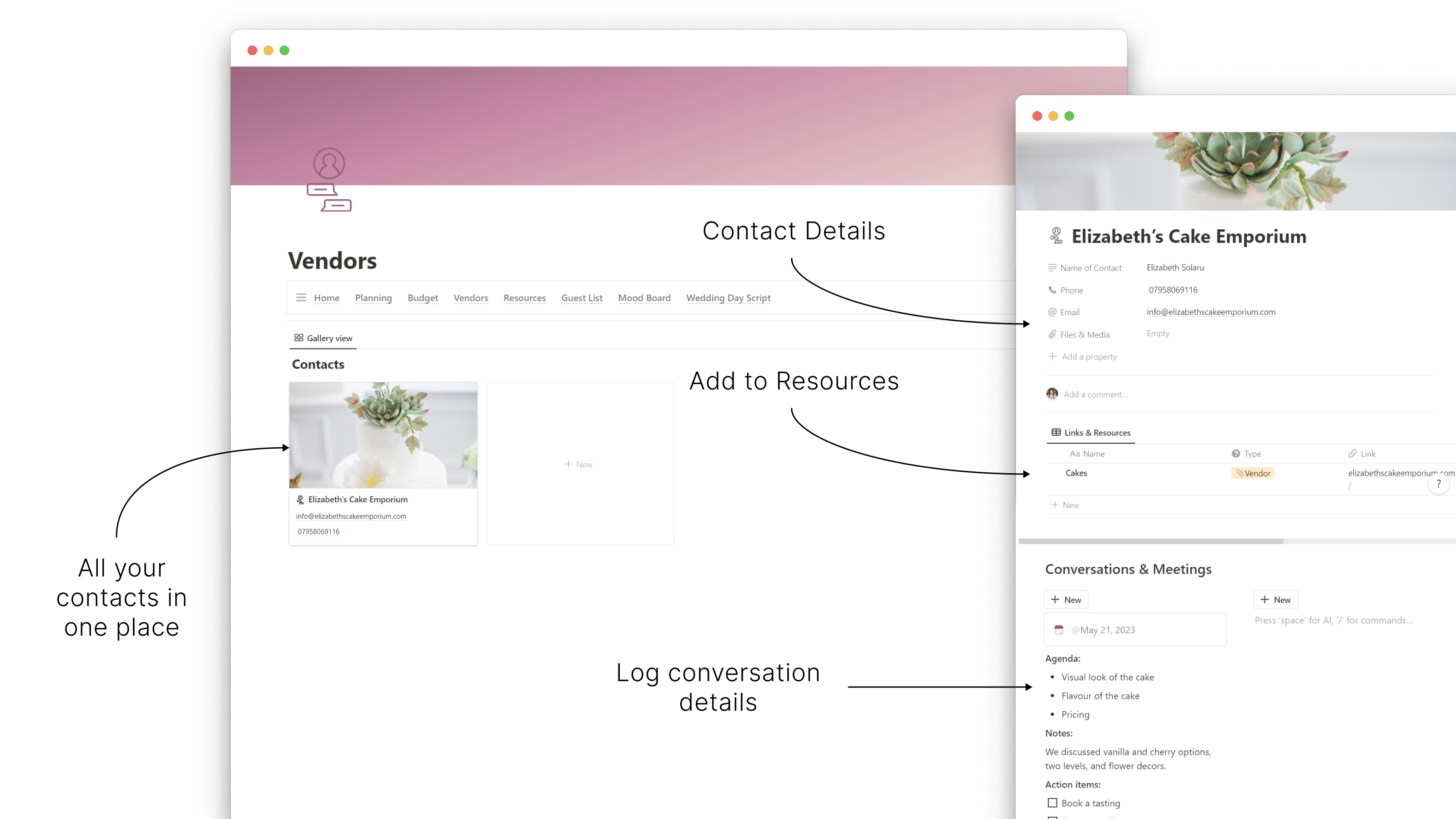 Centralized Hub You can bid farewell to scattered sticky notes and files. This template provides a centralized hub where you can store all your information, resources, inspiration images, and vendor contacts. Say hello to a clutter-free and easily accessible digital space.