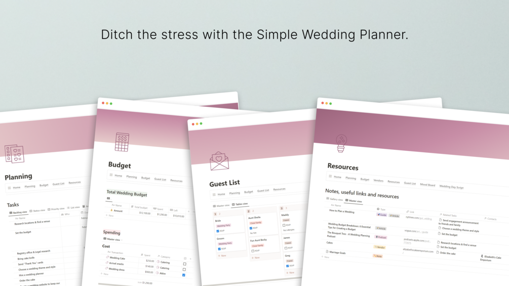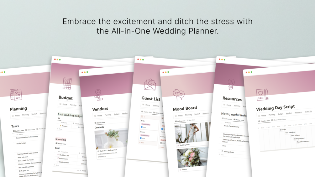 Comprehensive Planning Sections The template covers all the essential aspects of wedding planning, from budget management and guest lists to venue selection and vendor coordination. Everything you need is neatly organized and easily accessible, saving you precious time and ensuring no detail is overlooked.