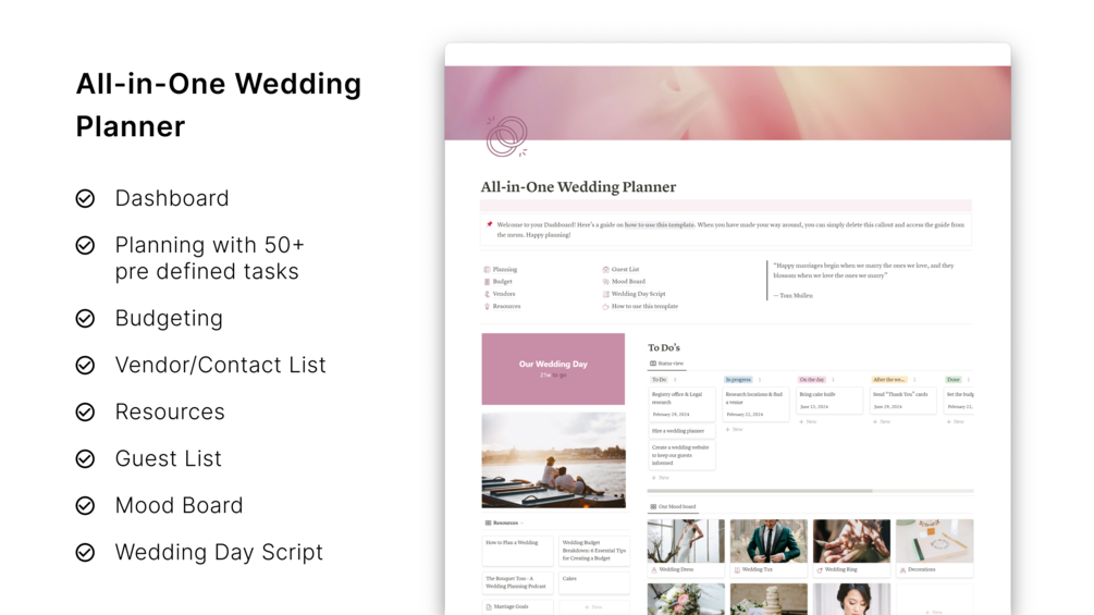 Great for Collaboration Planning a wedding often involves multiple people, including your partner, a wedding planner, and a wedding party. Notion is perfect for seamless collaboration, allowing everyone involved to contribute, comment, and stay updated.